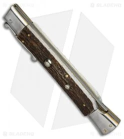 This 9″ Italian Stiletto from Lepre comes in the Sicilian Picklock style with a stag horn handle and a mirror polished clip point blade. Lepre creates beautiful automatic knives with the handcrafted details collectors are looking for. This 9″ model has a horn handle with nickel silver bolsters, pins, and buttons. Brass liners add a classic finishing touch to the design. The clip point blade has a plain edge and a polished finish. Upgrade your collection with an automatic stiletto from Lepre Knives.