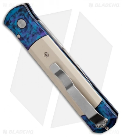 This Godfather features a satin finished 154-CM stainless steel blade and a blue jazz anodized aluminum body with ivory Micarta inserts and a pocket clip.