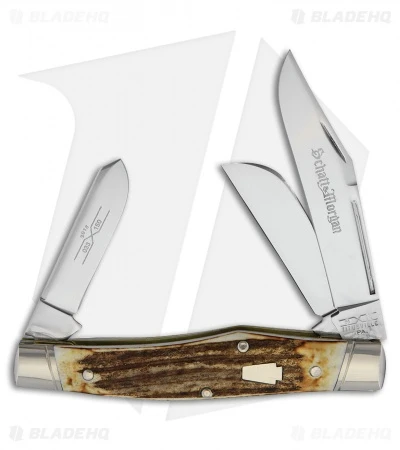 - Burnt stag handle with nickel silver bolsters and an inlay shield.